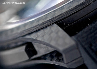 Das innere Gehäuse und die Grundstruktur des äußeren Gehäuses besteht aus keramisiertem Aluminium, und dann wird Kohlefaser auf der Außenseite geschichtet. Und die Laschen sind ausgehöhlt, um das notwendige Material auf das Minimum zu reduzieren.